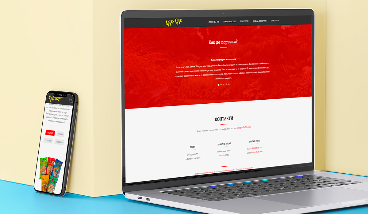 В онлайн магазин "Хрус-хрус" заложихме на високо качествени изображения и подробна информация на продуктите им. Актуализираме информацията и добавяме новите продукти. Сайта е пригоден лесно и удобно клиентите да могат да се запознаят с продуктите, да поръчат от сайта или да се свържат с фирмата.